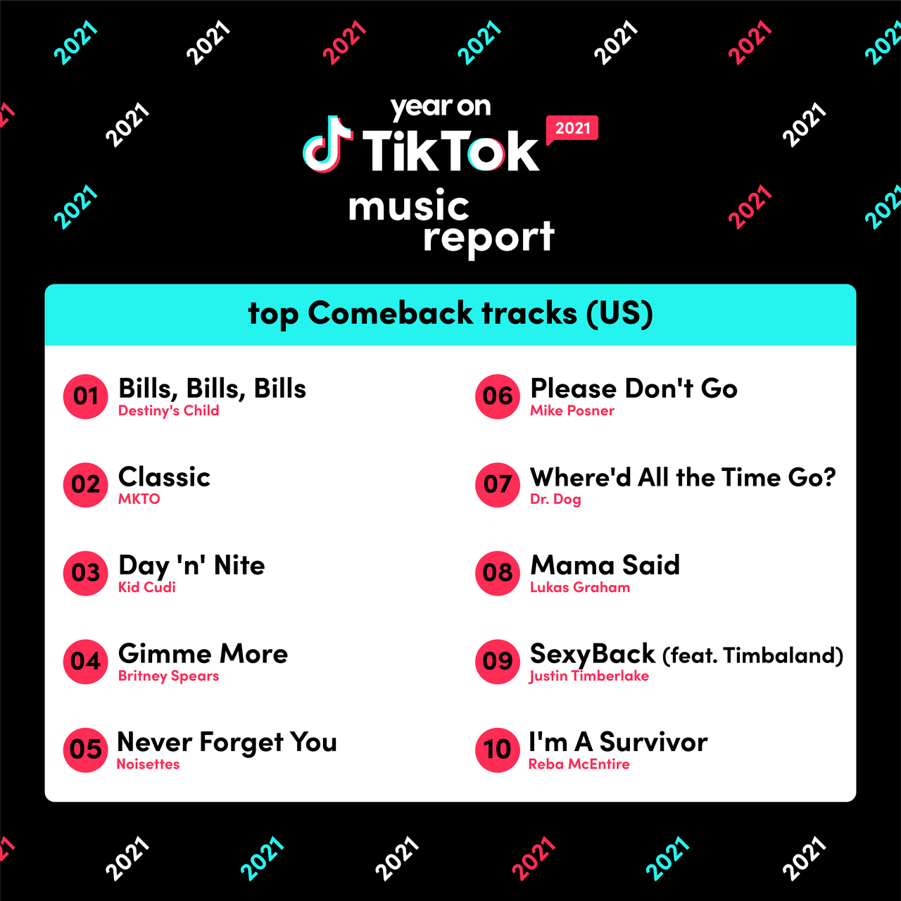 However, this trend wasn't limited to just classics. 2021 also saw a surge of songs from the early 2000’s and 2010’s take off and go viral on the platform as noted in their “Top Comeback Tracks”.